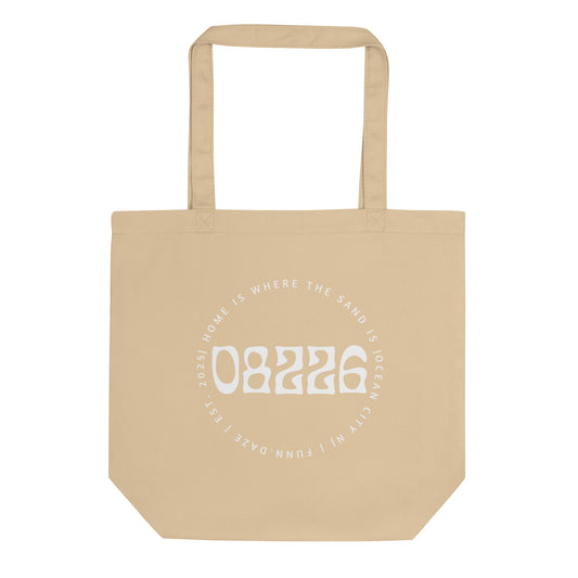 "08226" (white on blue on sand, one side) eco tote bag
